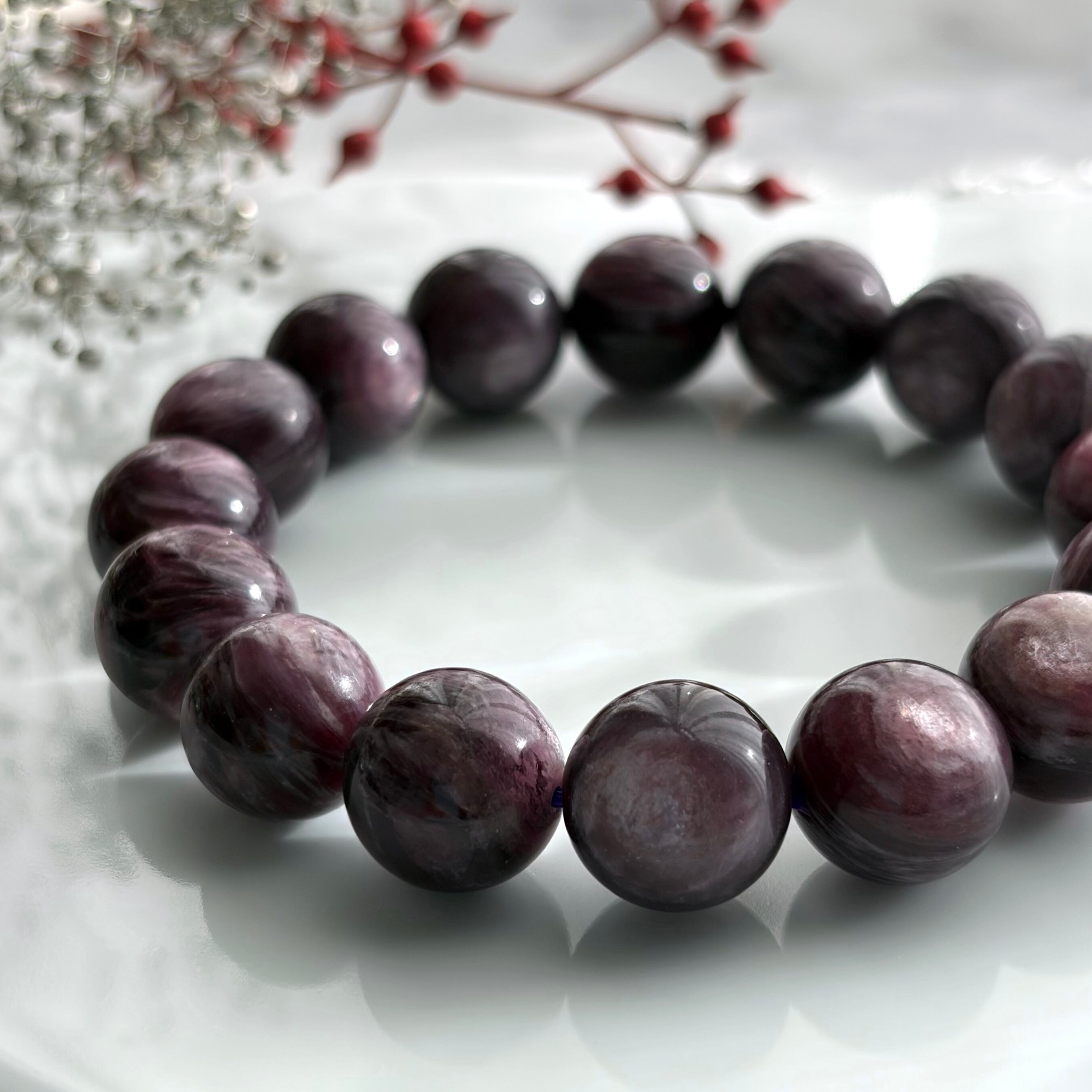 シラーとうねり模様が魅力的な、濃厚レピドライトブレスレット。