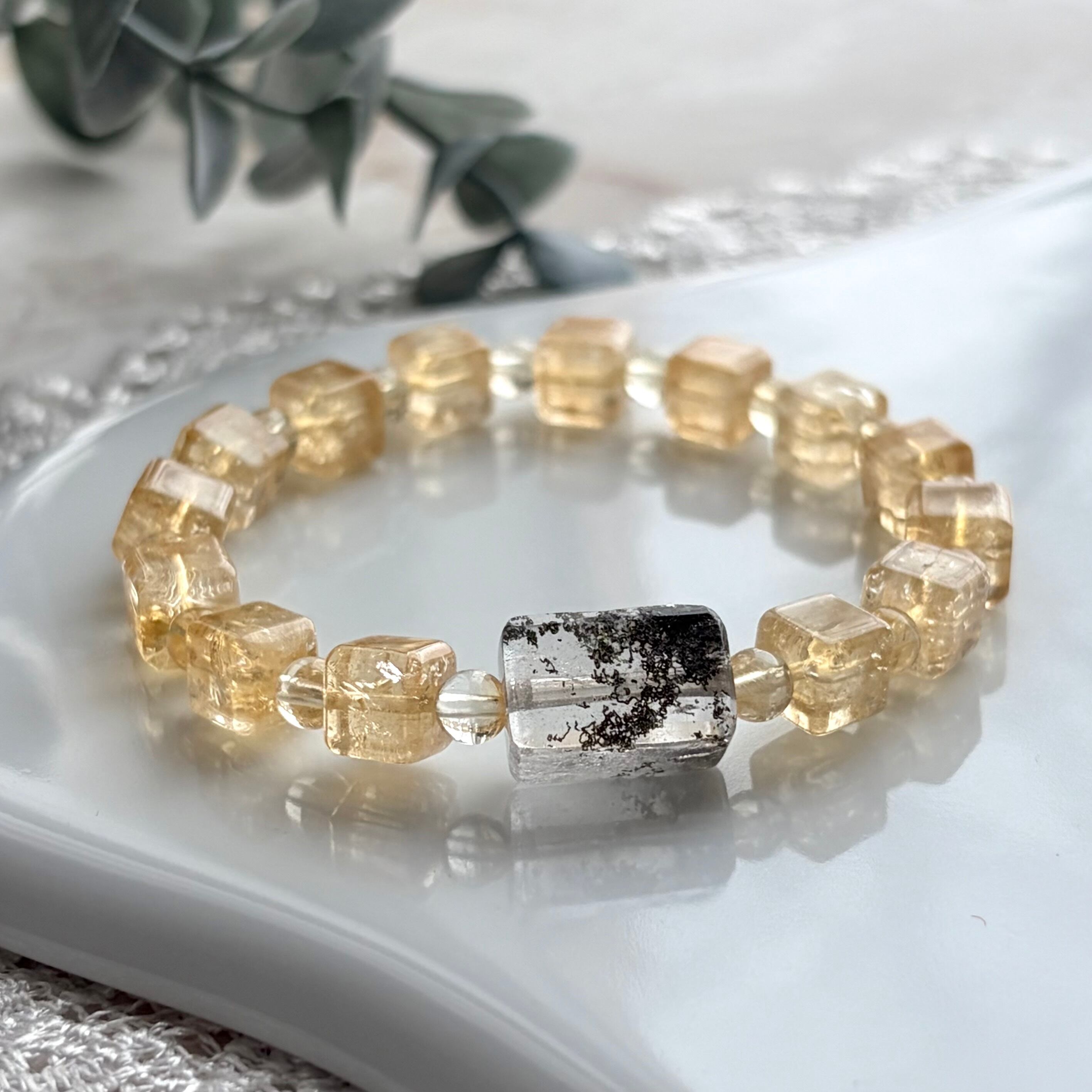 明るい色合いのシトリン。小さめのスクエアビーズの中にはクラックがあり、光を受けると小さなレインボーがチラチラと現れます。